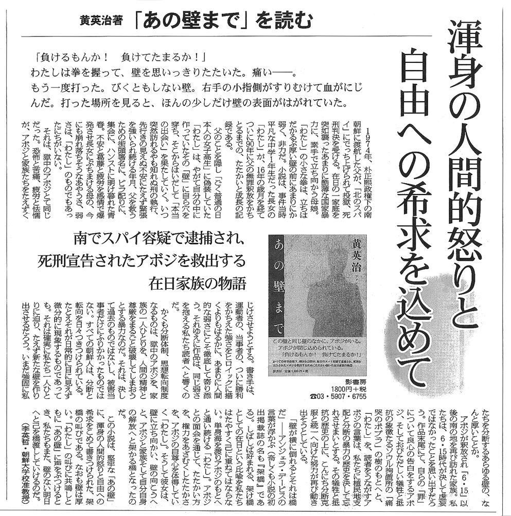 黄英治『あの壁まで』は、一読すると韓国独裁政権に苦しめられた在日韓国人家族の健気な話として読まれうるのだが、実のところ日本帝国主義を告発した作品でもある。一人の少女の精神的成長に私たちは、良かった良かったと拍手を送るのではなく、「特定秘密保護法」に反対する、反動の時代に抗う希望の灯として読みたい。