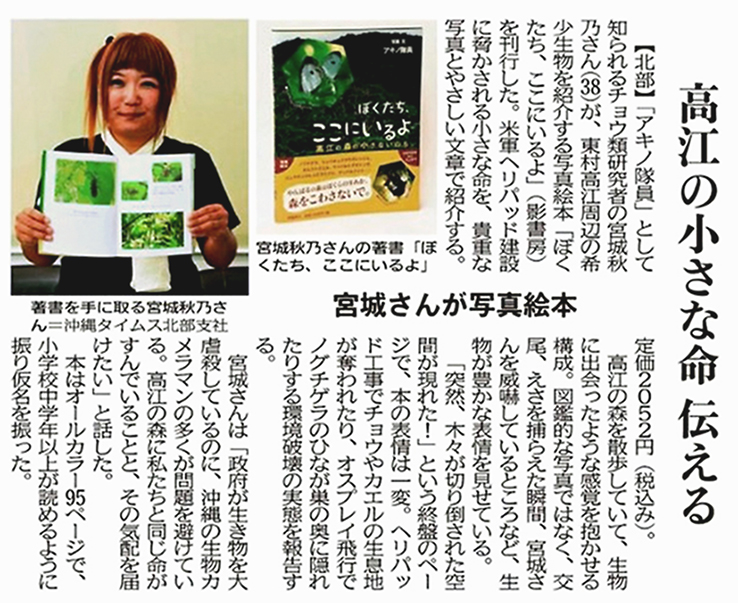 やんばるの生態系に精通するチョウ類研究者、宮城秋乃さん(アキノ隊員)が初の写真絵本「ぼくたち、ここにいるよ 高江の森の小さないのち」(影書房)をこのほど、出版した。やんばるの森に広がる大自然と命の恵みを美しい写真とユーモアあふれる文章で紹介。東村高江に森を切り開いて造られた米軍新型輸送機オスプレイのヘリパッド(着陸帯)が固有の生態系にもたらす影響などについても切り込んでいる。